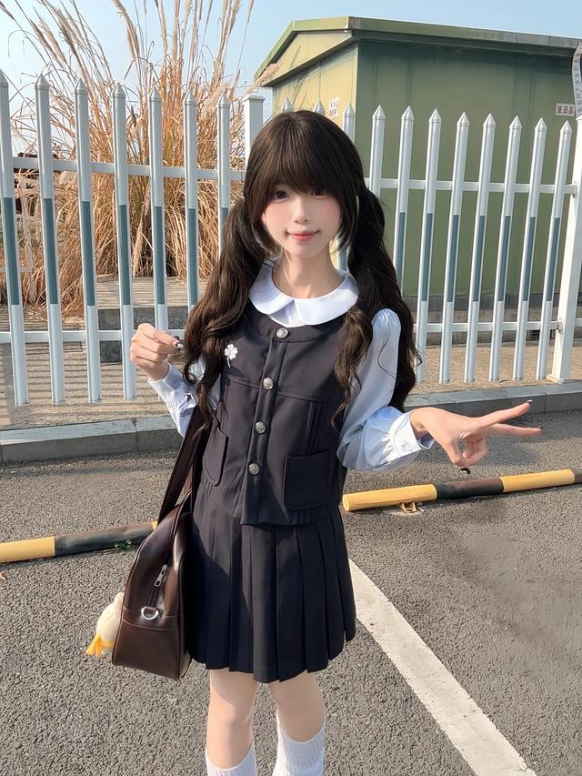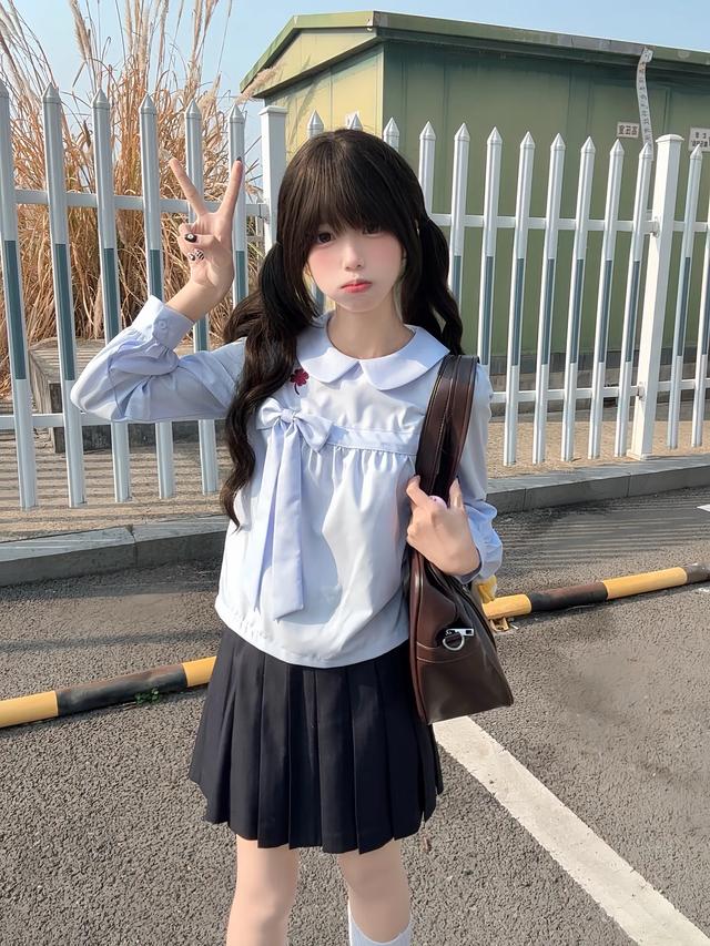 浅蓝衬衫配黑裙,干净又乖巧,自带让人安心的软萌感。