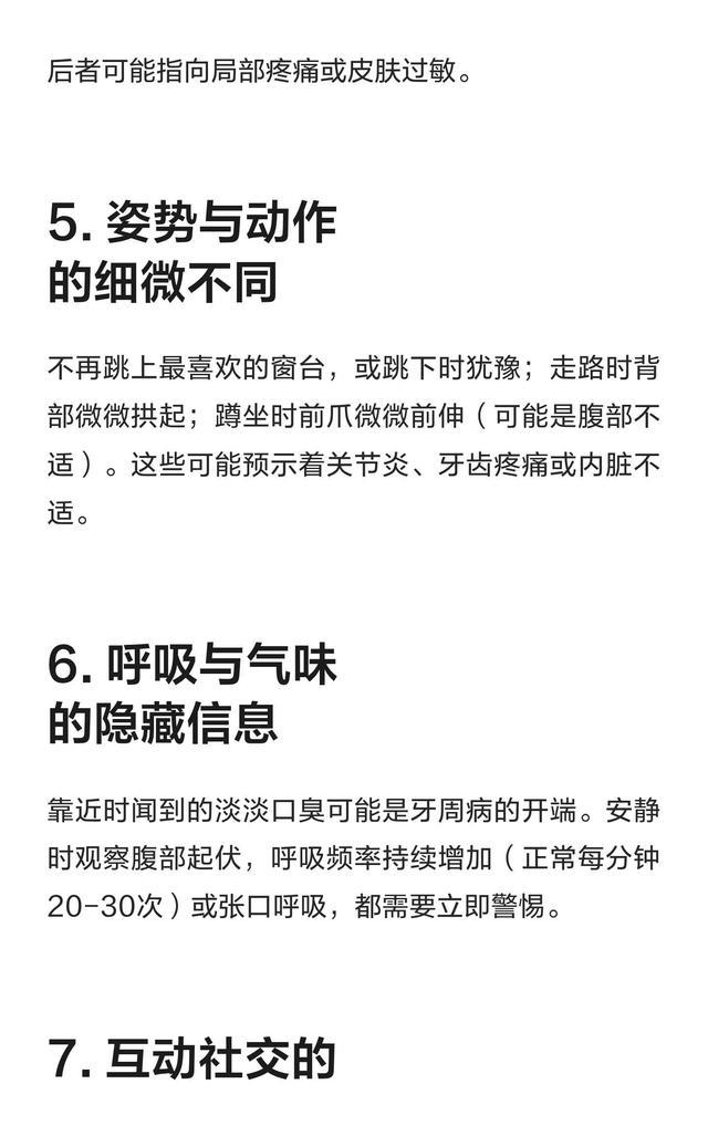 猫咪喝水突然变多,或者不愿意再跳上窗台,这不只是闹脾气,这是在用动作告诉你身体出了问题。 r r猫天生不爱露出疼痛,很多病在早期只会通过这些细微变化露头。 r r每天盯一眼吃喝拉撒、走路、梳毛,就能把异常抓在起点,少走弯路,少花冤枉钱,也能少一次夜里着急去医院。 r猫的祖先在野外生活,受伤或生病会被捕食者盯上,所以要把不舒服藏起来。 r这种本能留在家里也没有消失。 r看起来精神正常,照样会肚子痛、牙疼、关节卡住。 r语言不会说,动作会说。 r喝水次数、猫砂盆里尿团数量、走路姿势、梳毛时间,就是最直白的“身体报告”。 r把这些日常情况记下来,做出它独有的“健康基线”,变化一冒头就能看见。 r喝水变多是警灯。 r成年猫每天需要的水量大致在每公斤体重40到60毫升。 r体重五公斤的猫,全天喝水通常在200到300毫升。 r用量杯接水,早上装满,晚上看少了多少,就有个数。 r短时间内明显超过平常,可能是肾脏负担加重,也可能是血糖升高。 r长时间口渴会让猫频繁去水碗、趴在水龙头边、深夜起来饮水。 r家里空气干、吃干粮多、夏天热,这些都会让水喝得稍微多一点,幅度不会太大。 r出现翻倍的情况要警觉。 r排尿的变化和喝水是一对。 r用结团猫砂时,一个尿团大约代表一次排尿。 r平常一天三到四个团,稳定在一个范围,突然增到五六个甚至更多,说明身体在把多余的水排出去。 r尿团偏小但次数增加,多见膀胱炎;尿团又大又多,合并体重下降,多见糖尿问题或肾脏问题。 r猫砂外面有尿点,常常是来不及憋或排尿痛。 r猫砂盆高度太高、入口太窄,老年猫腿脚吃力,也会出现漏尿和不愿进盆,要分辨开。 r跳不上窗台是另一个信号。 r年轻时跳上跳下轻松,出现退缩,可能是关节磨损,腰背疼,或者心肺耐力下降。 r猫不爱叫痛,更多是“少做”。 r沙发也不愿意上,抓挠柱也不想扑,睡觉时间拉长。 r走路时爪子落地偏外,背有点拱,动作慢,都是身体在省着用。 r家里地板太滑,指甲太长,也会让它不愿意跳,剪指甲、铺地毯、加踏台,可以先排除环境因素,再看身体因素。 r梳毛习惯是镜子。 r健康的猫天天自我清洁,毛顺,皮肤油脂均匀。 r牙疼的猫不喜欢张嘴,舌头梳毛减少,下巴和胸前容易出现油腻结块。 r关节不灵活的猫背部和尾根不容易够到,毛会打结,皮屑增多。 r毛发光泽突然暗淡、脱毛成片,可能是内分泌问题或营养不均。 r食盆换了口味、环境温度大变,毛也会有调整期,但不会同时出现行动减少、饮水增加这类系统性变化。 r吃饭变化得认真看。 r食欲突然大增,体重反而掉,很像甲状腺激素过高。 r食欲下降,搭配呕吐、口臭,多见牙周问题或胃肠不适。 r猫的牙石、牙龈发炎很普遍,年纪越大越明显。 r嚼东西掉渣、偏爱软粮、吃完后用爪子摸嘴,都是牙不舒服的迹象。 r用手轻轻掀嘴唇,牙龈通红、出血、牙齿根部黄褐色包裹,要安排牙科检查。 r牙疼会把猫变成“沉默顾客”,不闹也不吃,体重很快掉。 r体重的数字能说真话。 r每周同一天、同一时间称重,记录到纸上。 r波动在百分之二到三算正常,超过这个范围要想原因。 r长时间吃不够或吸收问题,体重会线性下降。 r糖类代谢问题、甲状腺问题,体重也会掉得快。 r短时间体重增多,可能是吃得太咸喝水多,也可能是体液堆积。 r老年猫体重过轻,抵抗力差,恢复慢,日常监测意义更大。 r呼吸和心跳也能在家观察。 r安静躺着时,每分钟呼吸二十到三十次是常见范围。 r胸口起伏明显加快、张嘴喘、爪子伸直趴着,不愿蜷缩,是心肺负担大。 r心跳一般在每分钟一百二十到一百八十次,紧张时会上去,休息时会下来。 r呼吸和心跳长时间高,爬两步就歇,精神不佳,合并不愿跳,心脏病或呼吸道问题需要考虑。 r年龄是个关键维度。 r十岁以上的猫,关节磨损常见,影像学检查能看到变化的比例很高。 r慢性肾病在老年猫里比例也高,尿检和血液检查能早期发现。 r糖尿问题在整体猫群里比例不高,但肥胖是风险加速器。 r口腔疾病在大多数猫一生中都会遇到,牙结石和牙龈炎出现率很高。 r年龄增长带来的改变,要在人设环境里做适应,比如加斜坡、降低跳跃高度、换成低边猫砂盆。 r家庭场景里可以做简单的量化。 r水碗改成刻度杯,早晚记录。 r猫砂盆里尿团数目用手机拍照存档,一眼看出变化。 r称重用厨房秤或带托盘的电子秤,把猫放到固定容器里,减少乱动。 r毛发梳理安排到固定时间,梳下来毛量平时有个平均值,突然多或突然少都标记一下。 r把这些记录写到一本小笔记里,日期、数值、备注,一条条清楚,过两个月会形成自己的平均线。 r出现异常时要把干扰因素剔除。 r换了新粮、盐分高,水喝得多一些属正常。 r![]() |