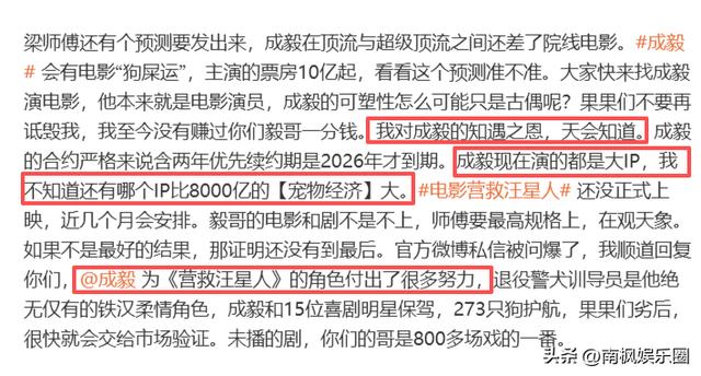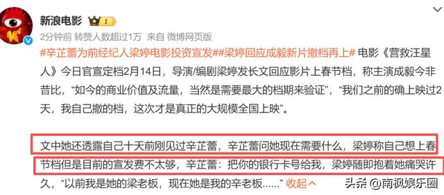 ![]() 好复古的海报,却因为中间站了一个成毅,倒是与情人档有些匹配。 然而,眼看着已经进入了宣传期,片方的官方账号竟然在短视频平台被封了。 ![]() ![]() 所以,成毅的粉丝当下正在极力抵制。 评论区飘满了“不支持、不宣传、不观看“的言论。 确实抓马,当流量明星都在勇闯影圈时,成毅人生中第一部一番电影却被粉丝大肆抵制。 ![]() 不过倒是情有可原,毕竟在成毅还没那么出名的时候,这部已经烂了的影片将其作为七番小配角进行宣传。 如今成毅坐上顶流的位置,片方又换了个嘴脸,这谁能受得了? 还是扑得人尽皆知的作品,什么心思早已不用多说。 ![]() 再比如《泰坦尼克号》。 尽管也有网友认为,这种完全可以在网上看的电影,还要进行重映,分明就是冲着割韭菜来的。 但,毕竟这也是全球影史榜上有名的经典IP,确实有些情怀在。 ![]() 要说情怀,《山河故人》的重映票房倒是也不错。 豆瓣平台被31万人打出8.1的高分,再次于大银幕与观众见面,我想大部分影迷是能够接受的。 另外,重映的节点与剧情时间线相呼应,当然比较有意义。 ![]() 无论是需要视效,还是拥有情怀,在观众眼中可以重映的影片,自然是好评如潮的经典IP。 然而,有些电影重映,目的不要太明显。 比如《无名》。 豆瓣评分6.6,顶流配影帝再加上春节档,票房硬是没突破10亿。 再比如《热烈》。 票房更是惨淡,两部电影到底针对谁家粉丝,懂的都懂。 ![]() 以及周星驰的系列大电影。 或许是《大话西游》给了周星驰信心,后面《食神》与《鹿鼎记》又接连重返大银幕。 100多万票房真的没什么画面,可对于片方来说,似乎是“能圈多少圈多少”。 结语只能说有些人割韭菜的嘴脸实在是不太好看。 其实梁婷早在辛芷蕾坐上国际影后宝座时,引发全网热议的小作文中,就提过《营救汪星人》这部电影。 她表示“我对成毅的知遇之恩,天会知道”,以及“成毅现在演的都是大IP,我不知道还有哪个IP比8000亿的‘宠物经济’大”等等。 所以,当时她其实就已经有打算将该影片放出来。 ![]() 确实,作为梁婷旗下的艺人。 成毅与辛芷蕾16年前,还真在恐怖片《诡爱》中有过合作。 当时辛芷蕾饰一番女主,而成毅则是二番男主,看得出是梁婷最看重的两名强将。 ![]() 而当时的纷争过后,梁婷还喊话辛芷蕾,表示这几年囤了17个剧本没拍,目标是拍一部豆瓣8.8分以上、票房要十位数的电影。 她要当导演,让辛芷蕾来当主演,并表示“你看着办”。 这句话还真让辛芷蕾的粉丝冷汗直冒。 ![]() 如今,梁婷还真透露与辛芷蕾见过面了。 辛芷蕾问其需要什么,梁婷称自己宣发费不够,而辛芷蕾则直接让她把银行卡号发过来。 看来二人的友谊确实匪浅。 ![]() 可就算拉上辛芷蕾,也不能改变《营救汪星人》的质量。 就算没有与成毅的纷争问题,都已经9年的电影了,现在放出来真的会有好成绩吗?#冬日生活打卡季##营救汪星人# -END- 南枫娱乐圈 有品质的娱乐观点 |