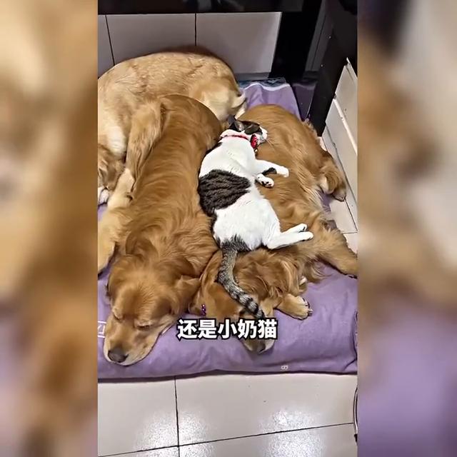 这只猫特别爱挤在这三只狗中间睡觉,整天都要跟它们黏在一起。其实它从还是小奶猫的时候就是跟它们一起长大的。有时候主人找不到它,最后都会发现它安安稳稳地躲在狗堆里。甚至其中一只狗狗生宝宝的时候,它也会守在小狗旁边帮忙照顾。