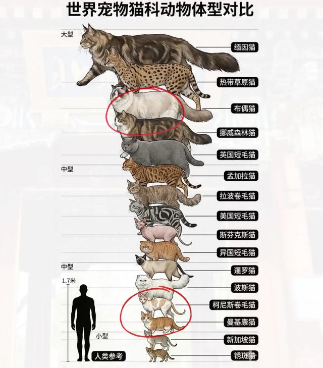 “我家猫才半岁,就快赶上我家狗大了!” “同样是猫,为啥我家的像个小耗子,朋友家的像头小狮子?” 很多铲屎官都有过这样的疑惑:明明都是猫,体型差距怎么能这么大? ![]() 最近一张“世界宠物猫科动物体型对比图”火了,把常见宠物猫按体型分成了大、中、小三个梯队,看完才发现,原来猫界的“身高鄙视链”这么明显。 • 大型猫:猫界“巨无霸” 缅因猫是当之无愧的“猫界巨人”,成年后体长可达1米以上,体重轻松突破10公斤,站起来甚至能到成年人腰部,抱起来像抱了个小婴儿。热带草原猫、布偶猫、挪威森林猫也属于大型猫,气场十足,需要更大的活动空间和更多的食物。 • 中型猫:主流“大众脸” 这是最常见的宠物猫梯队,也是我们日常接触最多的类型。英国短毛猫、美国短毛猫身材敦实、毛发短密,是典型的“圆滚滚”代表;孟加拉猫、暹罗猫、波斯猫各有特色,有的像小豹子,有的优雅如贵族,体型适中,适合大多数家庭饲养。 • 小型猫:猫界“小不点” 曼基康猫因为腿短,看起来格外小巧;新加坡猫、锈斑猫才是真正的“猫界侏儒”,成年后体重只有1-2公斤,甚至可以捧在手心,是世界上最小的猫种之一,特别适合小户型家庭。 猫的体型不仅决定了它们的外表,还影响着饲养成本、活动空间和性格特点。下次再看到别人家的“巨猫”,就不用惊讶了——原来猫界也有“巨人”和“侏儒”。 |