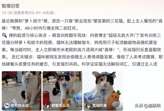 作为【互联网高强度冲浪达人 自己养了猫还不够,每天依旧云吸猫】的你们,想必最近一定刷到了“萝卜·纸巾·真棒”的视频吧? ![]() 图自:博主超级无敌大开门 不过,在全网玩梗、二创的同时,也引发了一些铲屎官的科学思考: 以猫咪的智商,到底能不能区分“萝卜”和“纸巾”? 大开门,真的只是在蒙答案吗? 下面我们就来详细解答~ 一,猫咪能正确指认“萝卜”和“纸巾”吗?(1)显而易见的答案是:不能! 虽然2005年的研究发现猫咪拥有较强的视觉识别能力,可以通过视觉输入 记忆来识别熟悉事物与新事物,但这仅仅代表猫咪有能力记住和区分“萝卜”、“纸巾”这两个外型不同的物品(划重点)。 想要通过语言指令正确指认物品(听到萝卜—指认萝卜),需要理解这个语言指令,并将语言(声音符号)与具体物品(感官实体)联系起来,是另一个level的难度…… ![]() 实验画面模拟 图自:猫研所/引文2 结果发现,参与实验的41只猫咪都能捕捉到实验人员的眼神暗示,其中能成功找到隐藏食物的概率是70.42%,显著高于随机水平。 这说明猫咪懂得看人眼色,可以通过我们的目光,获取参考信息。 ![]() 图自:引文4 实验发现,猫咪可以敏捷觉察人类的表情和情绪变化,并改变自己行为(亲近积极情绪)。 ▍2020年意大利科研人员在此基础上加上了声音。实验向10只年龄2~10岁的猫咪分别展示了,主人和其他猫咪在开心和生气时的声音及图像,并观察猫咪的反应。 结果发现,猫咪能够区分其他猫和主人不同情绪时的表情,并将这些情绪与笑声、愤怒声对应关联起来。 ![]() 靠动作追踪,锚定答案的车总 图自:猫研所 小猫咪们虽然无法理解“萝卜”一词的含义,但是像“大开门”一样,能乖乖坐着答题、听到指令完成条件反射、察言观色蒙答案,已经是猫咪中的佼佼者了,非常值得一句“真~棒~”!!! ![]() 【本期所长互动】 快在评论区说出那两个字! ![]() ////////// 参考来源: [1]Okujava V, Natishvili T, Mishkin M, Gurashvili T, Chipashvili S, Bagashvili T, Andronikashvil G, Kvernadze G. One-trial visual recognition in cats. Acta Neurobiol Exp (Wars). 2005;65(2):205-11. doi: 10.55782/ane-2005-1557. PMID: 15960308. [2] Pongrácz, P., Szapu, J. S., & Faragó, T. (2018). Cats (Felis silvestris catus) read human gaze for referential information. Intelligence. doi:10.1016/j.intell.2018.11.001 [3]Roepstorff A. Things to think with: words and objects as material symbols. Philos Trans R Soc Lond B Biol Sci. 2008 Jun 12;363(1499):2049-54. doi: 10.1098/rstb.2008.0015. PMID: 18299276; PMCID: PMC2606706. [4]Galvan M., Vonk J. Man’s other best friend: Domestic cats (F. silvestris catus) and their discrimination of human emotion cues. Anim. Cogn. 2016;19:193–205. doi: 10.1007/s10071-015-0927-4. [5]Quaranta A, d'Ingeo S, Amoruso R, Siniscalchi M. Emotion Recognition in Cats. Animals (Basel). 2020 Jun 28;10(7):1107. doi: 10.3390/ani10071107. PMID: 32605256; PMCID: PMC7401521. [6]Zamora-López G, Zhou C, Kurths J. Exploring brain function from anatomical connectivity. Front Neurosci. 2011 Jun 21;5:83. doi: 10.3389/fnins.2011.00083. PMID: 21734863; PMCID: PMC3124130. [7]https://www.catster.com/lifestyle/cat-brain-vs-human-brain/ |