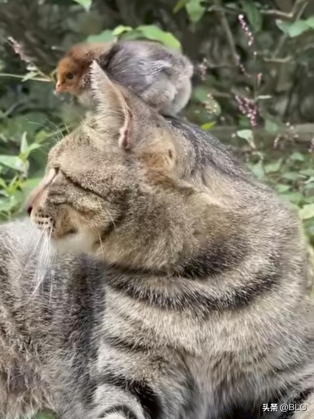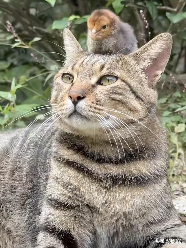 一只毛茸茸的小鸡崽,大摇大摆地爬上了猫咪的头顶,把人家当成了自己的专属暖床。