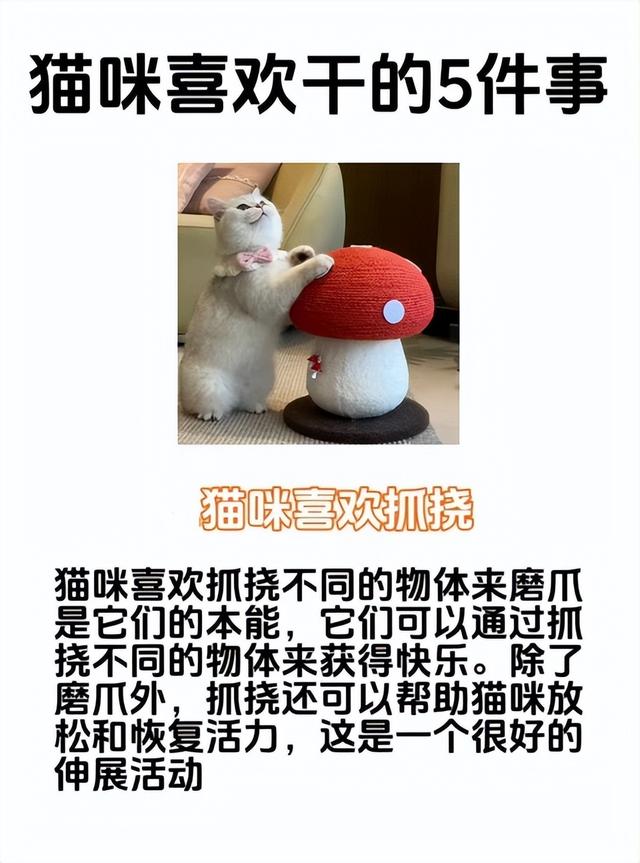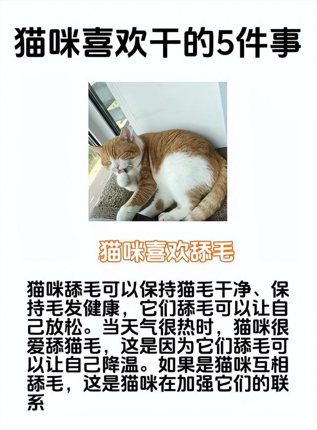 养过猫的都懂,修猫看似高冷又随性,实则有一堆雷打不动的爱好,天天重复也不腻。这5件事几乎是所有猫咪的共性,每一件都藏着它们的小天性,快来看看你家猫中了几个! 2. 磨爪狂魔:抓挠=快乐 放松猫咪乱抓沙发、猫抓板,真不是故意捣乱,是刻在骨子里的本能。抓挠既能磨掉老化的爪尖,还能通过伸展身体放松肌肉、恢复活力。 对它们来说,抓得越尽兴越解压,给够猫抓板,就能少遭点家具“毒手”。 3. 睡神本神:一天大半时间在补觉猫咪爱睡觉早不是秘密了,平均每天要睡12-16个小时,堪称“动物界睡美人”。毕竟它们是夜行动物,白天主打一个补觉蓄力,晚上才是活跃时间。 而且幼猫和老年猫更能睡,比青春期的小猫能躺多了。 5. 舔毛大师:清洁 降温 社交猫咪一天能花不少时间舔毛,不仅是为了保持毛发干净顺滑,还能帮自己放松情绪。天热的时候舔毛,唾液蒸发还能降温,相当于自带“空调”。 要是猫咪互相舔毛,那更是亲密的表现,是它们巩固关系的小仪式。 ![]() 这些看似普通的小事,都是猫咪热爱生活的方式,藏着它们最本真的天性。看懂这些喜好,才能更懂自家修猫的小世界~ 你家猫最爱干的是哪件事? |