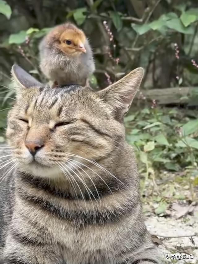 一只毛茸茸的小鸡崽,大摇大摆地爬上了猫咪的头顶,把人家当成了自己的专属暖床。