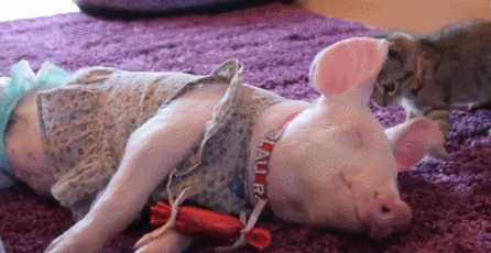 酒足饭饱后,宠物猪开始呼呼大睡。然而,家里的另外两位似乎并无困意,它们开始捣起乱来。先是小奶猫屁颠屁颠地走到猪的身边,对着猪的大耳朵,又挠又咬。 喵:大懒猪,睡什么睡,起来嗨!整天就知道睡,长得跟猪一样!